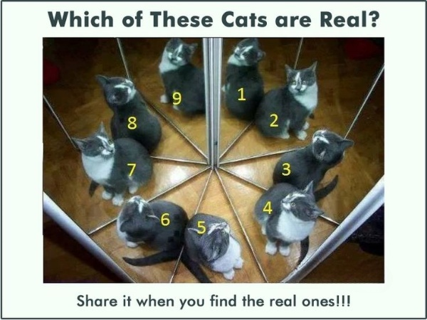 Still not convinced? Look at cats #2, #4, #7, and #9. Their faces and tails are mirrored, not just copied. Only a reflection can do that. Cat #5 is the anchor—the real one the mirrors are playing with.