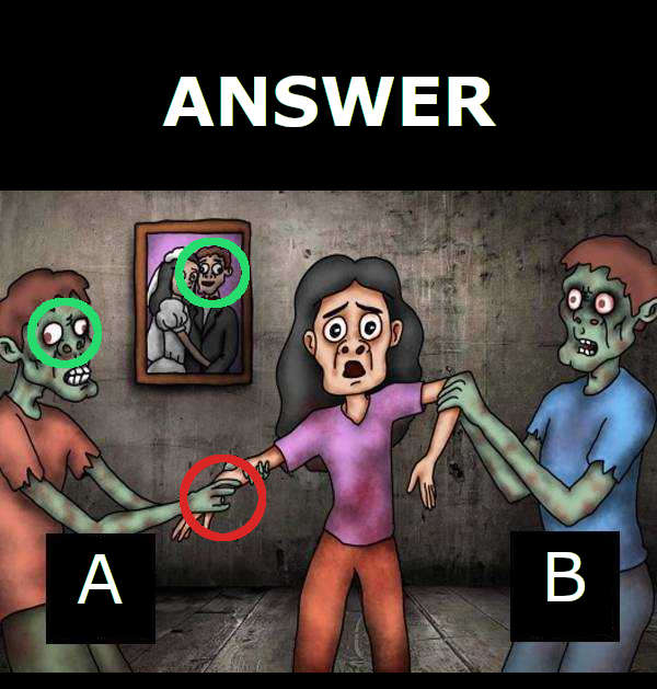 The riddle presents us with an image of a distressed woman standing in a room, surrounded by two zombie-like figures. The scene is unsettling, drawing us in with its eerie atmosphere. To solve this riddle, we must determine which of these figures is her true husband. The two choices, A and B, each offer different hints that we must decipher.