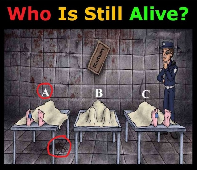 Picture this: A dimly lit room, eerily quiet, labeled “Mortuary.” Inside, three bodies lie on tables, each covered with a white sheet. Nearby, a police officer stands, deep in thought, seemingly contemplating the scene before him. The question that lingers is simple yet profoundly challenging: Who among these three is still alive?