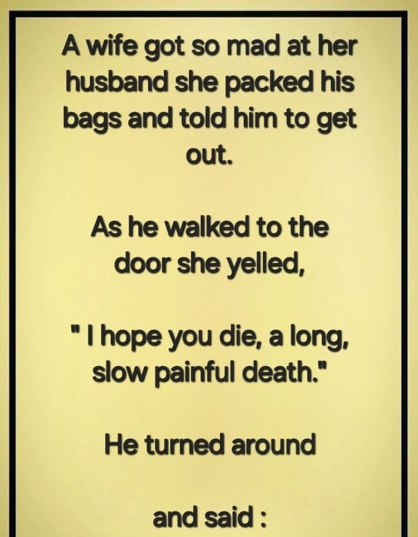 This joke opens with a situation familiar to many married couples. Imagine a wife who’s finally had enough of her husband’s antics. She packs his bags, storms over, and shouts, “Get out!” Her frustration is evident, and as her husband approaches the door, she can’t resist one last jab: “I hope you die a long, slow, painful death!”